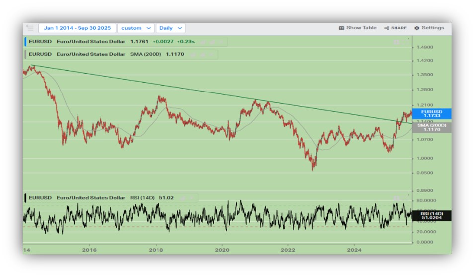De trend van de dollar is de afgelopen 10 jaar licht stijgend. Tien jaar geleden kostte een euro nog circa $1,40, drie jaar geleden minder dan $1,00. Na Trump’s herverkiezing steeg de dollar kortstondig van $1,12 naar $1,03, maar verzwakte daarna naar de huidige $1,18 per euro.